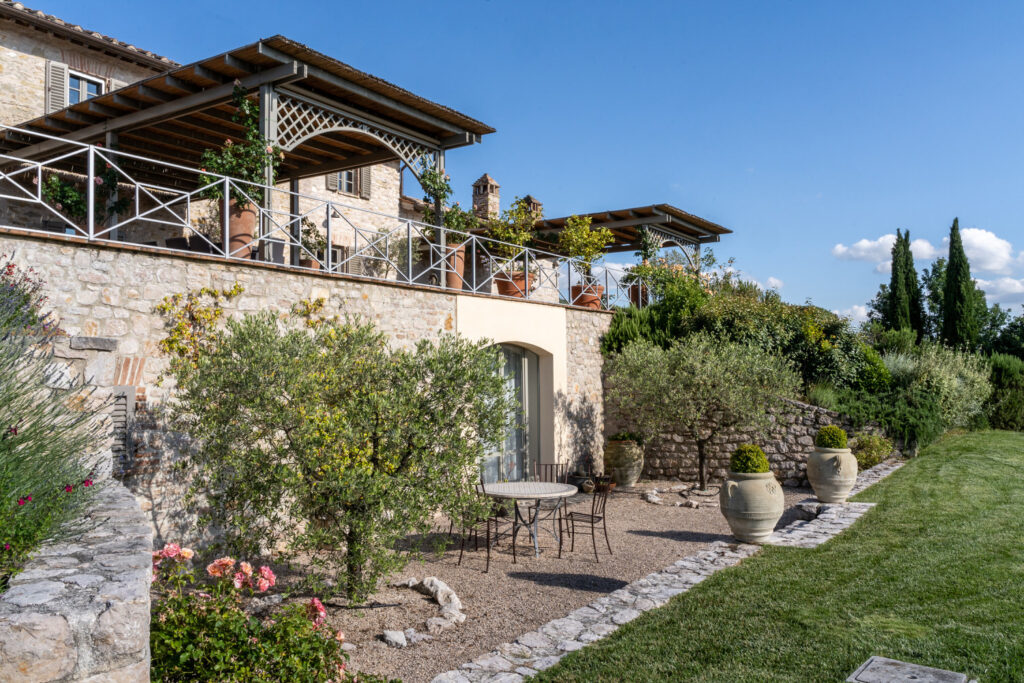 Villa Monticelli’s outdoor areas capture the true spirit of the Umbrian countryside. The private swimming pool overlooks the hills and forests below, surrounded by a lush garden and a relaxing area with loungers.