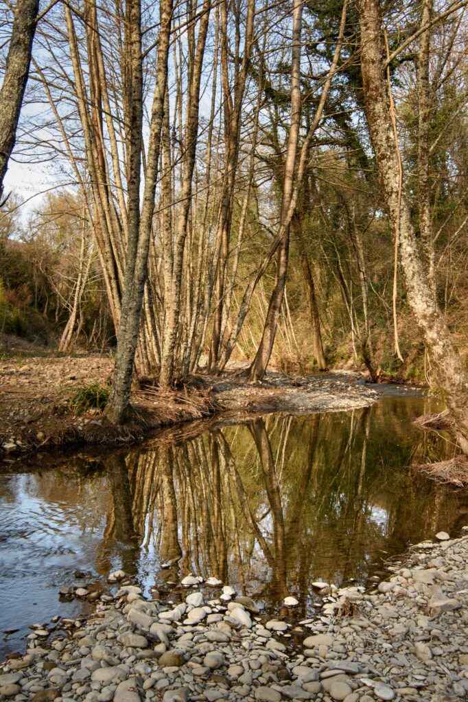 The infinity pool built where the old mill’s reservoir once stood is extraordinary: a unique place to swim, read, or simply enjoy the silence of the forest.