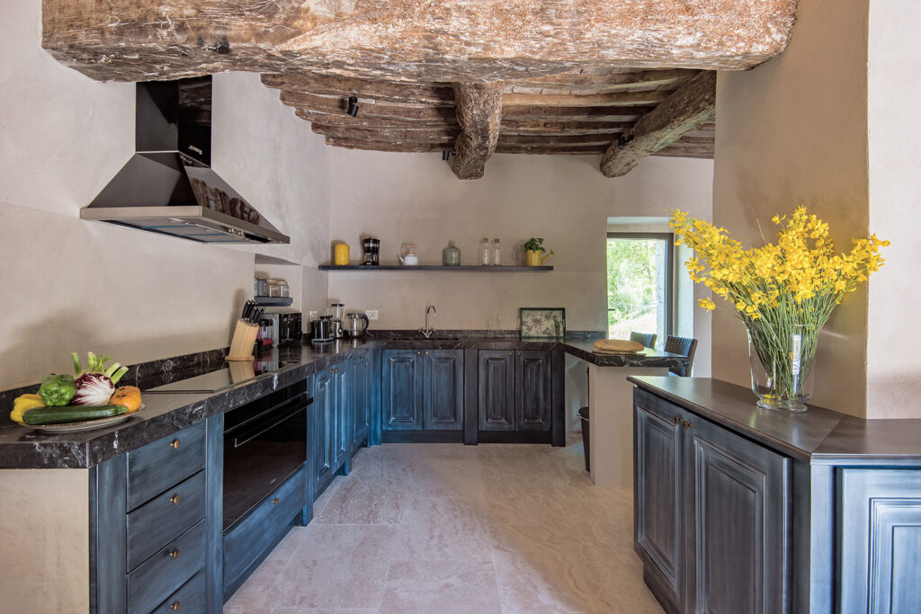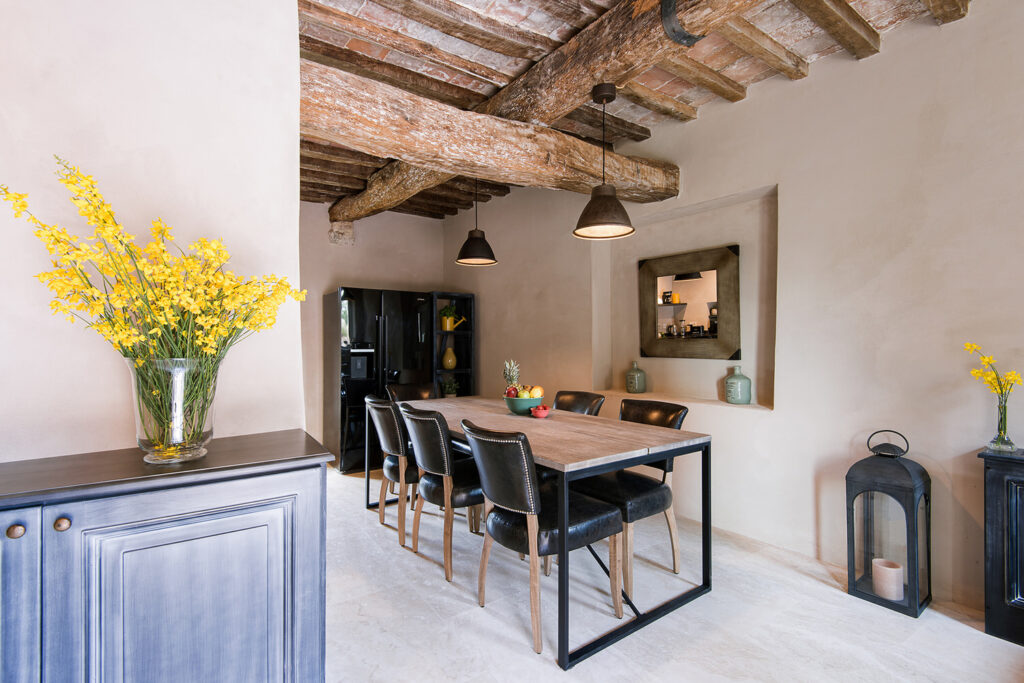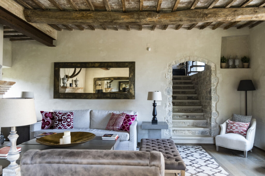 Inside, the villa combines the warmth of tradition with a refined contemporary touch. The spacious living room, illuminated by a grand arched window, opens toward the landscape and fills the interiors with light. The atmosphere is elegant yet welcoming, defined by rich fabrics, soft natural tones, and carefully chosen materials that create a sense of harmony and understated sophistication.